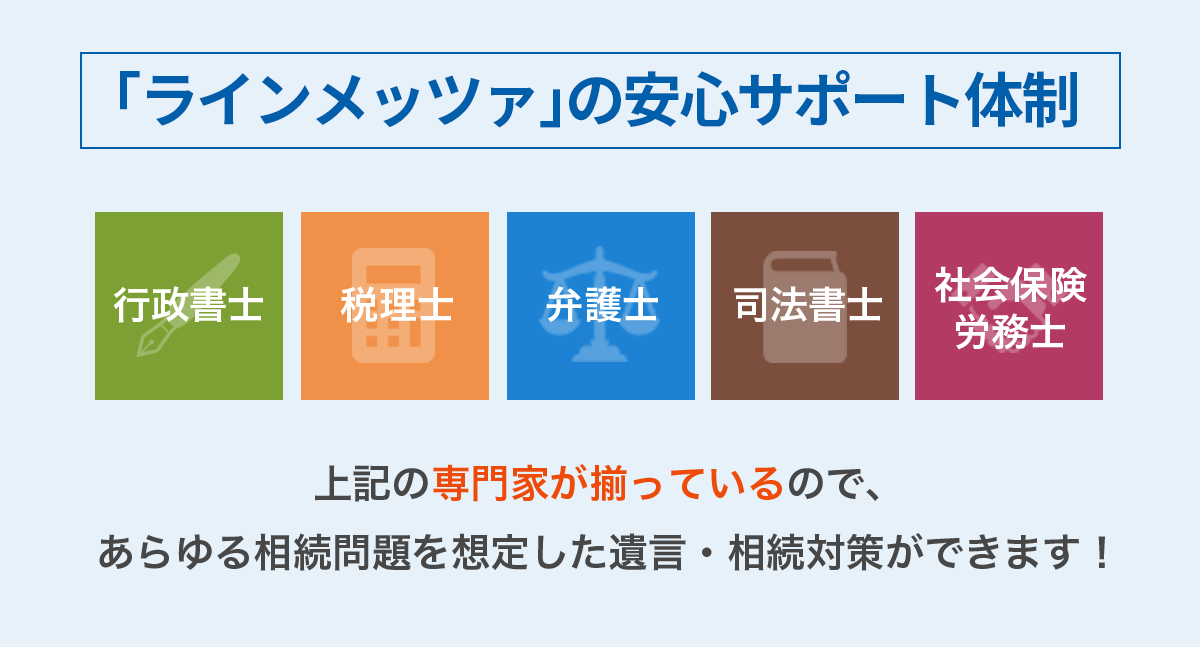 さらに、弊所は弁護士・行政書士・税理士・社会保険労務士とも提携をしておりますので、もし相続の時にトラブルがあった際は、すぐに信頼ができる専門家をご紹介させて頂きます。