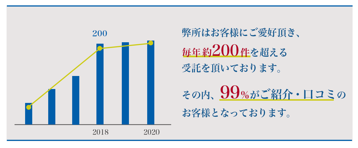 事務所を選ぶ際に、相続・遺言作成をメインの業務にしている先を選ぶことはもちろんですが、相談件数・受託件数が多い事務所を選ぶことも重要です。なぜなら、様々なパターンや複雑な相続・遺言書作成ケースへの対応を過去に行ったことがある場合は、打ち合わせや対策立て方もスムーズな為、時間もコストもかからず、遺言書作成が可能となることが多いからです。